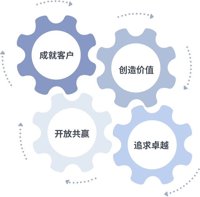 成就客户是一切决策的出发点,,,,创造价值是衡量所有工作的标准,,,追求卓越是红宝石hbs9988做事做人的态度,,,,开放共赢是红宝石hbs9988的格局也是最终的结果。。。。价值观的齿轮环环相扣,,推动着组织里的每个人不断向前。。